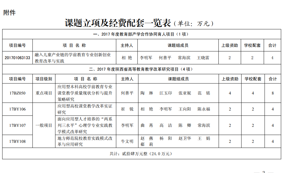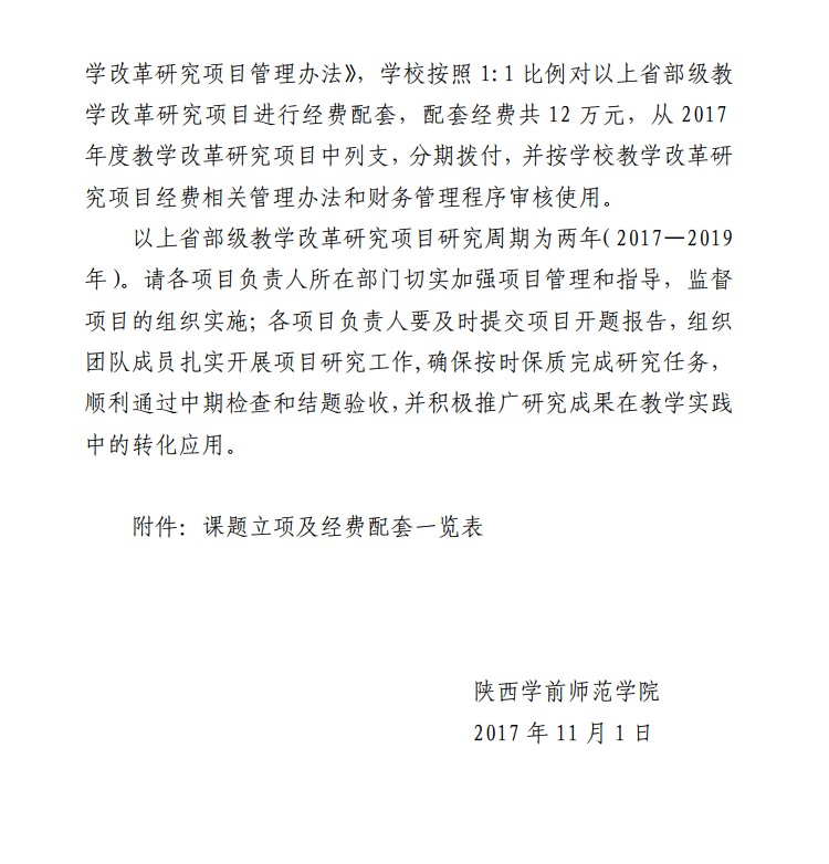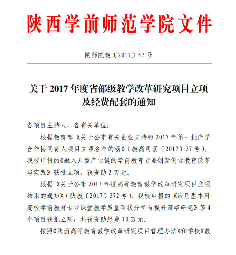 关于2017年度省部级教学改革研究项目立项及经费配套的通知 陕师院教〔2017〕57号