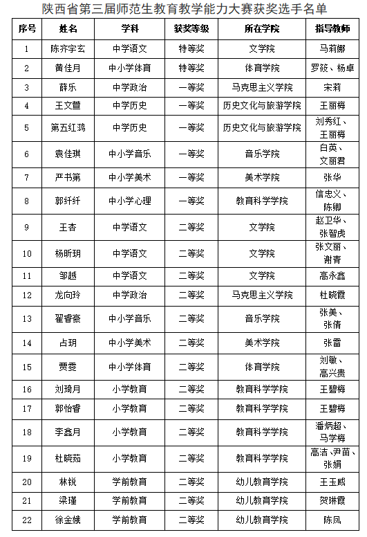 近日,陕西省教育厅正式公布了第三届高校师范生教育教学能力大赛决赛结果。我校学生在本届大赛中表现突出,取得优异成绩,共获奖22项。其中,陈齐宇玄等2名同学荣获特等奖、薛乐等6名同学荣获一等奖,王杏等14名同学荣获二等奖,马莉娜等3名教师荣获优秀指导教师。获奖数量位居全省第二名,特等奖获奖数位居全省第三名。