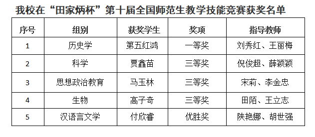 12月1日,“田家炳杯”第十届全国师范院校师范生教学技能竞赛在浙江师范大学落下帷幕。此次比赛设置一等奖、二等奖、三等奖和优胜奖,经过初赛、决赛的激烈角逐,我校5名选手获奖。其中一等奖1项、三等奖3项,优胜奖1项,学校首次在国家级师范生教学技能竞赛取得一等奖的突破。